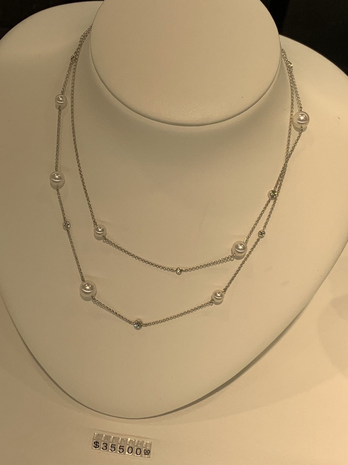 香港MIKIMOTO御木本18k白金珍珠间钻石款毛衣链项链长80cm5.8-7.5