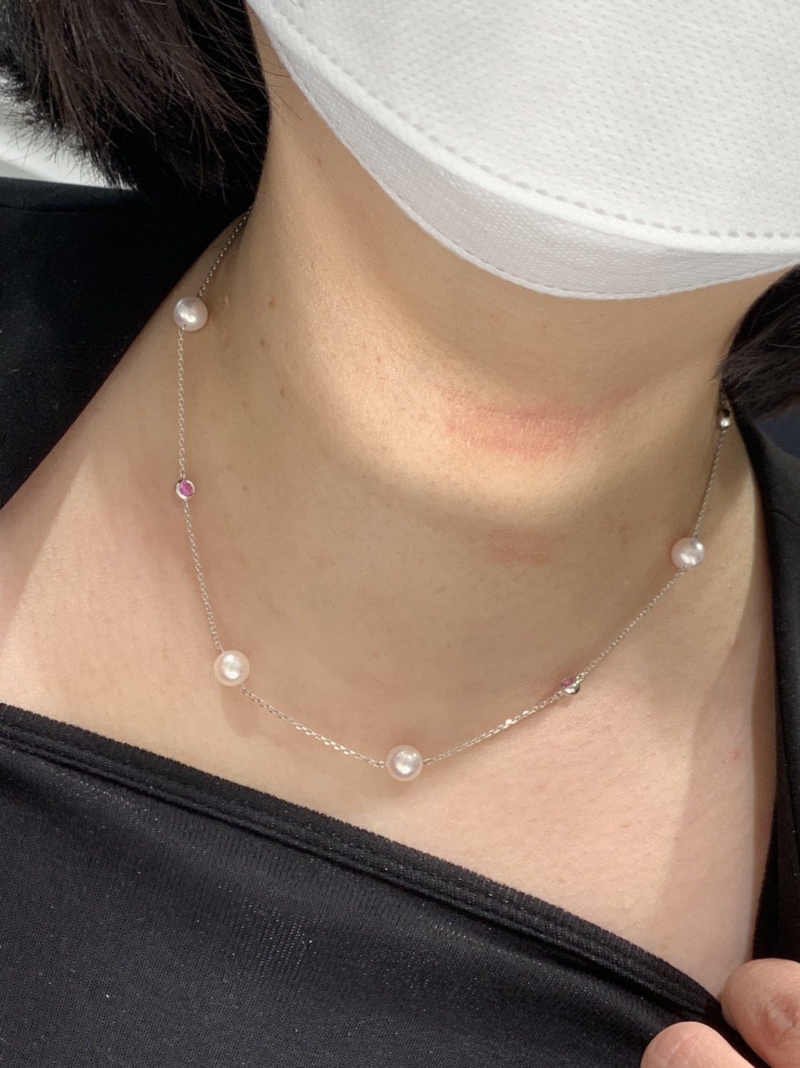 香港MIKIMOTO御木本18k白金珍珠红宝石款满天星女生项链颈链7mm