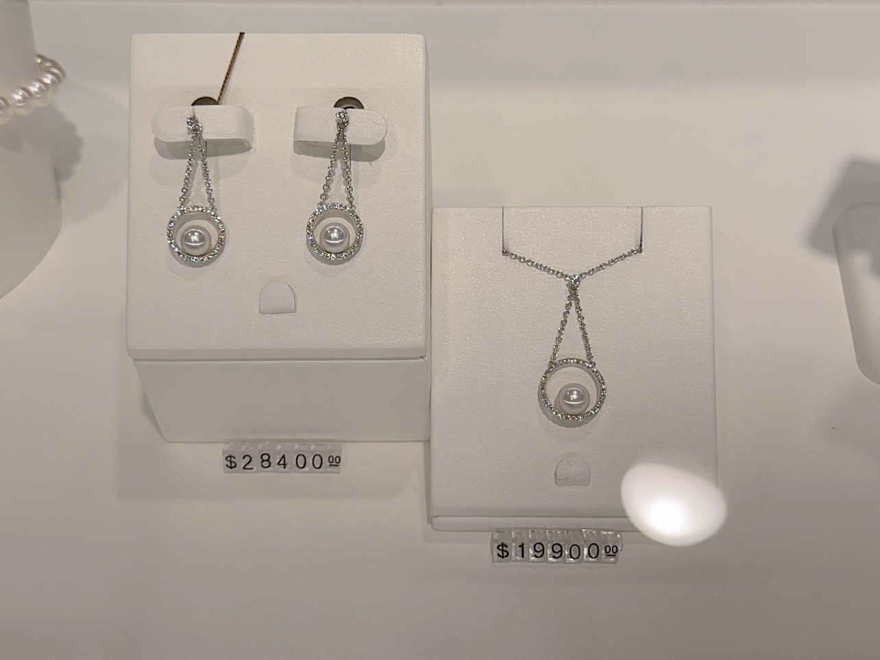 香港MIKIMOTO御木本 18k白金圆圈镶钻天然海水珍珠耳环项链