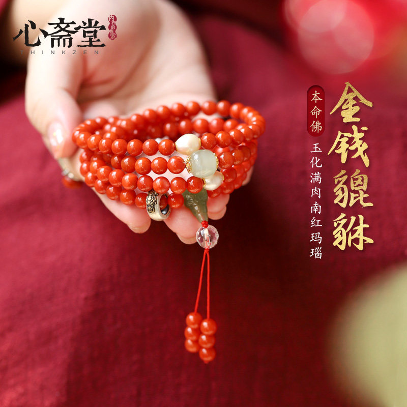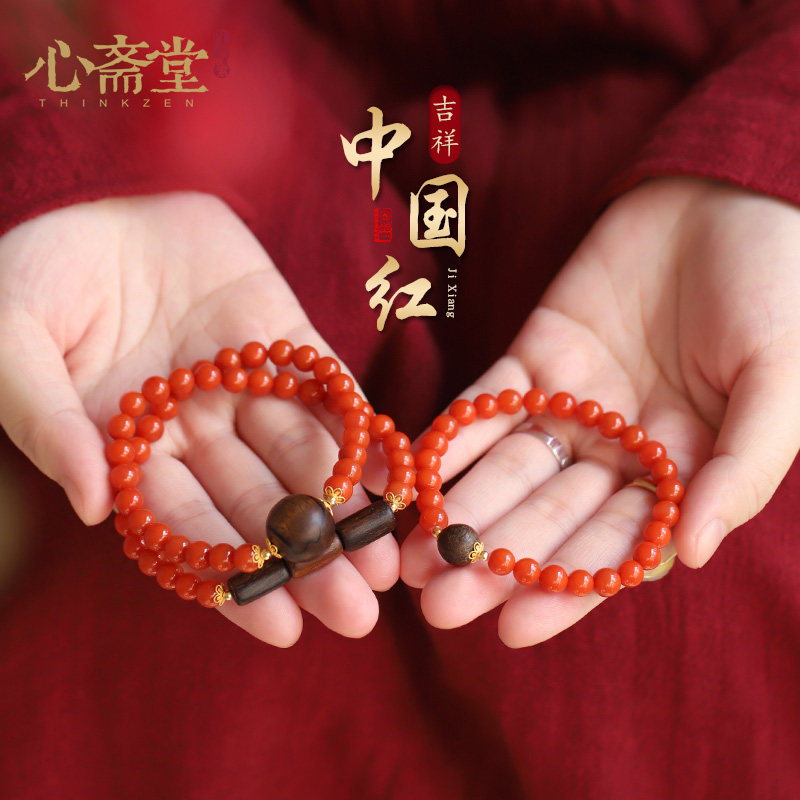 心斋堂【樱红】新国风樱桃红南红玛瑙手链女佛珠和田玉本命年手串