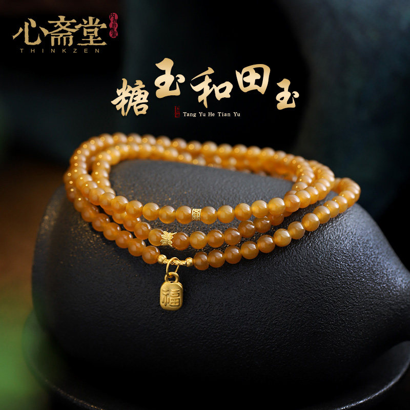 心斋堂【隐慧】天然新疆和田玉糖玉手串女黄金牌玉石手链小众叠戴