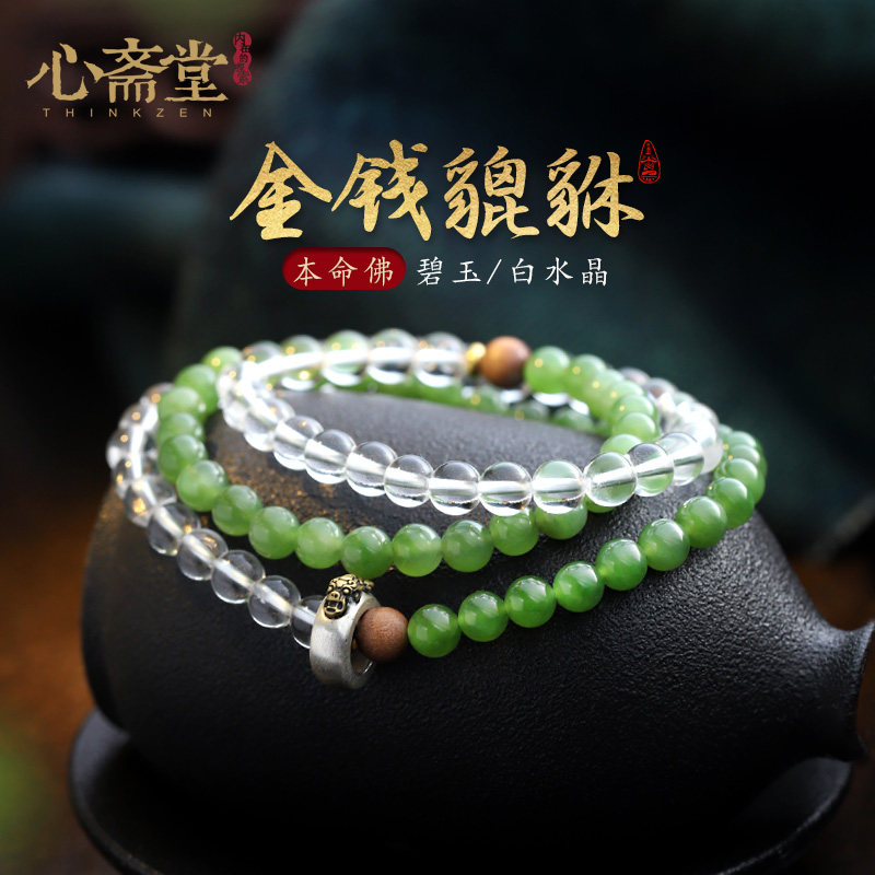 心斋堂【心悦】新国风和田玉菠菜绿碧玉手链白水晶本命年女款手串