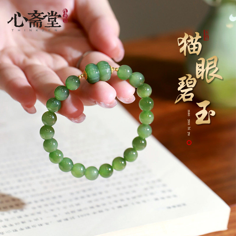 心斋堂【宝玉】收藏俄料高冰猫眼碧玉手串和田玉莲花玉石送礼物女