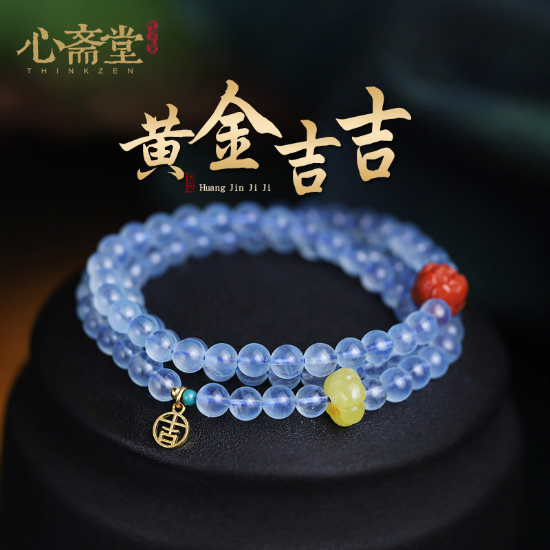 心斋堂【守愿】天然海蓝宝石多圈冰种手串黄金手链三圈水晶女项链