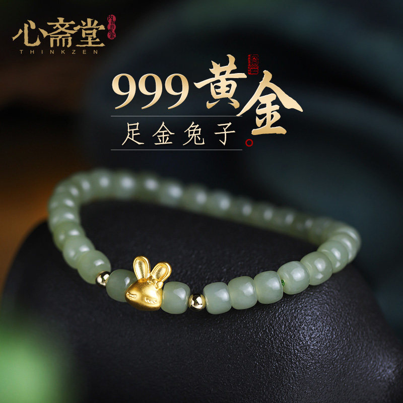 心斋堂天然和田玉手串生肖兔黄金手链 999足金转运珠本命年兔耳朵