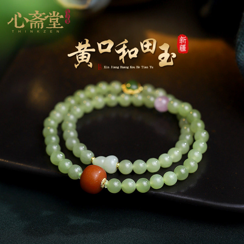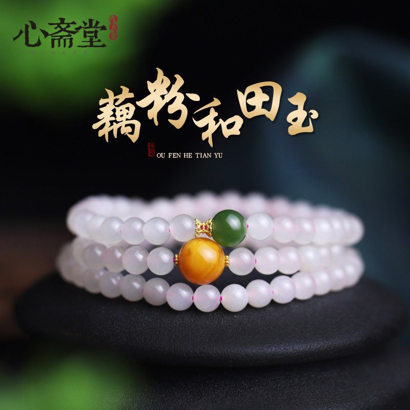 心斋堂天然藕粉和田玉多圈手串女保真粉色玉石手链蜜蜡小众手饰品