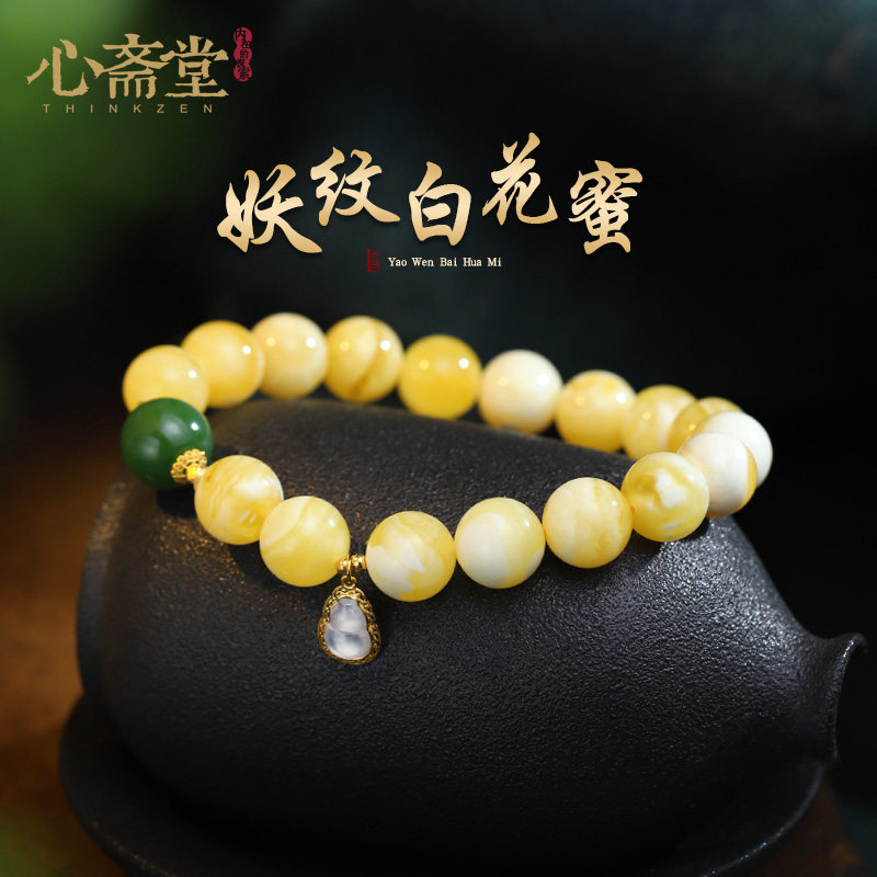 心斋堂【花海】天然俄料妖纹白花蜜蜡手串男女款琥珀鸡油黄手链