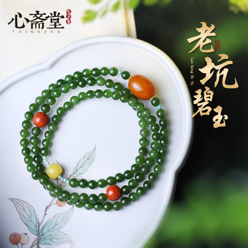心斋堂【寂静】天然冰底菠菜绿碧玉手串和田玉蜜蜡老蜡K金夏手链