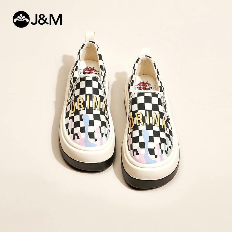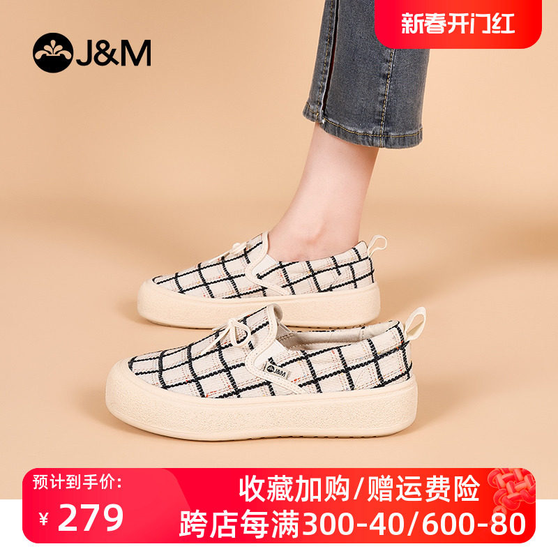 J&M快乐玛丽方头棋盘格纹帆布鞋子女一脚蹬懒人鞋女布鞋女板鞋女