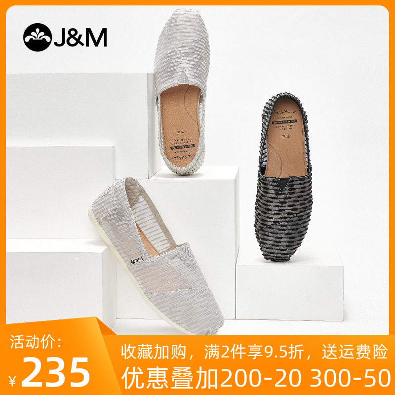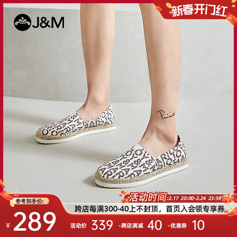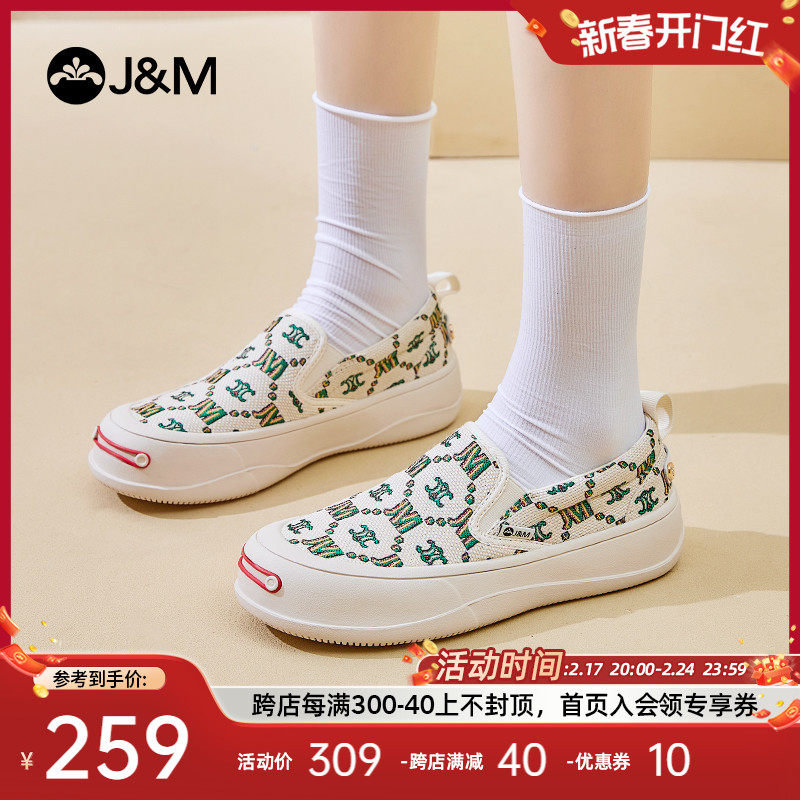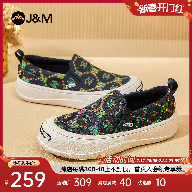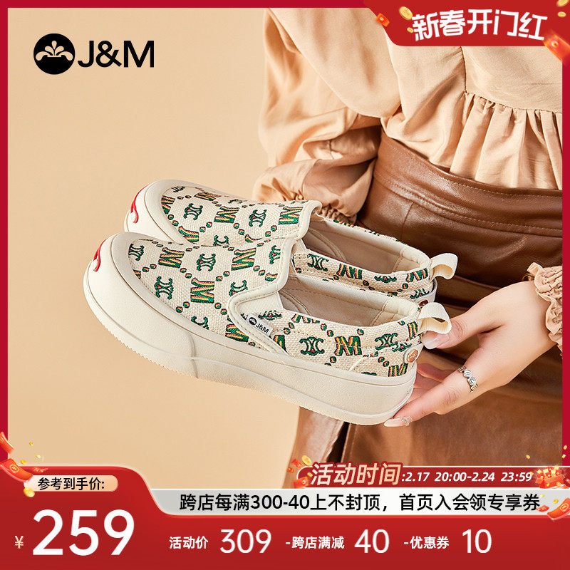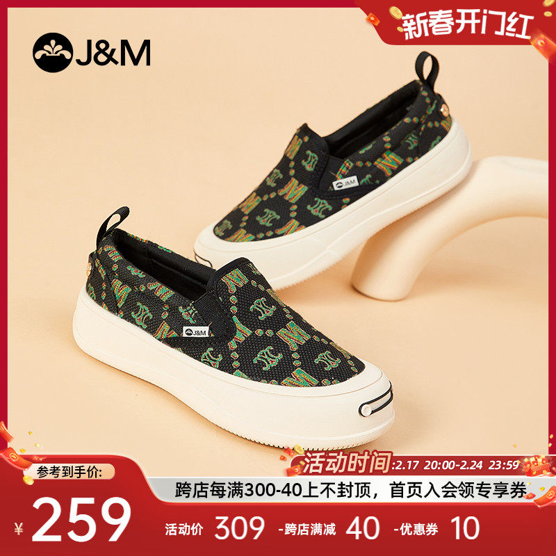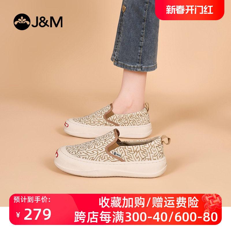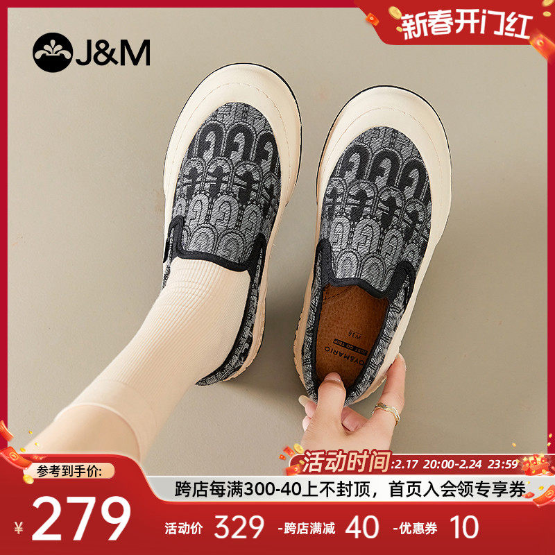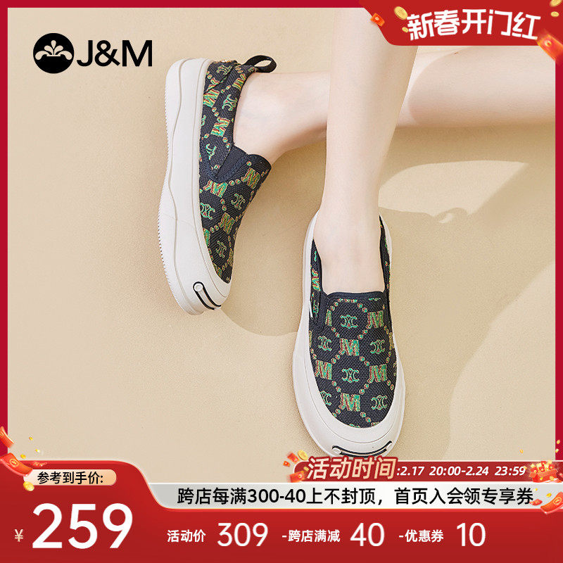J&M/快乐玛丽女鞋乐福鞋2024春季新款老花开口笑懒人一脚蹬布鞋