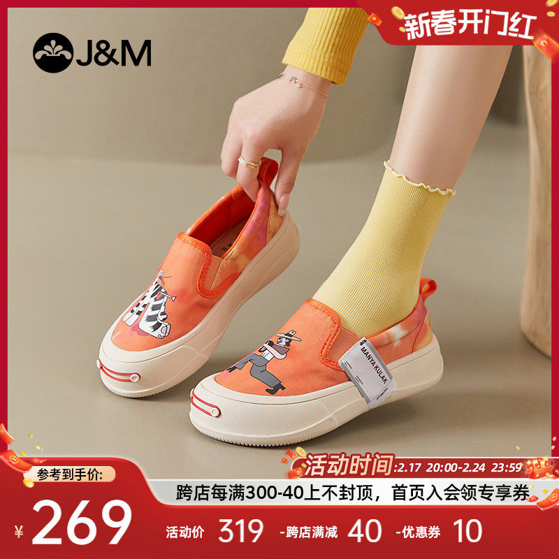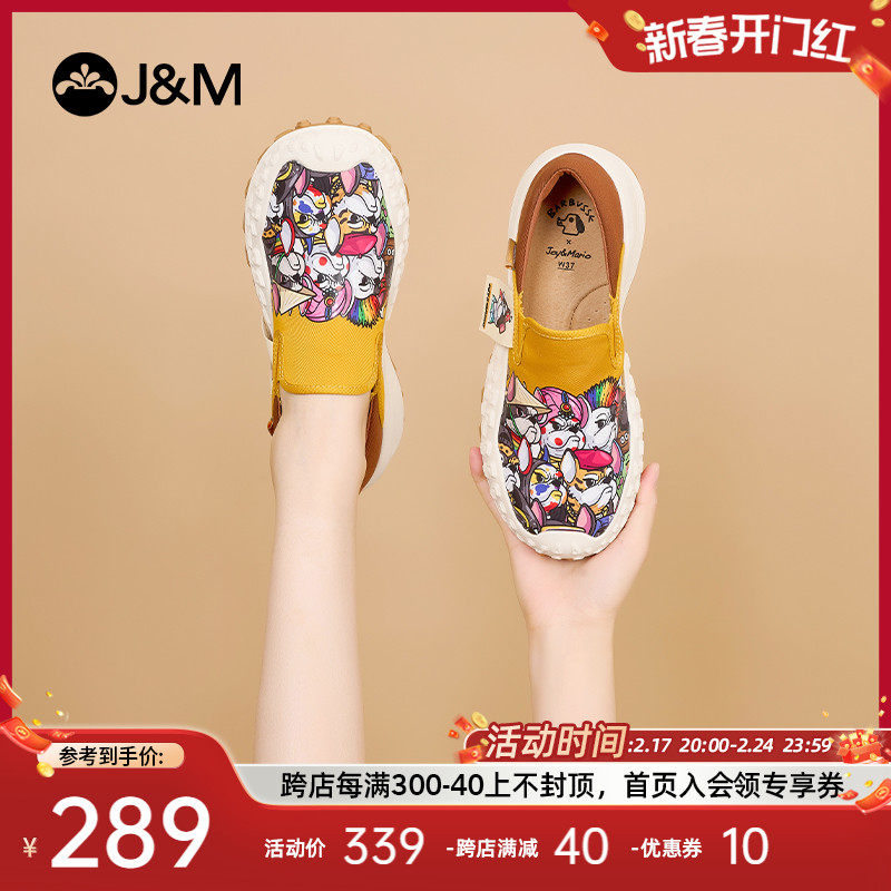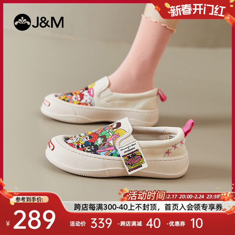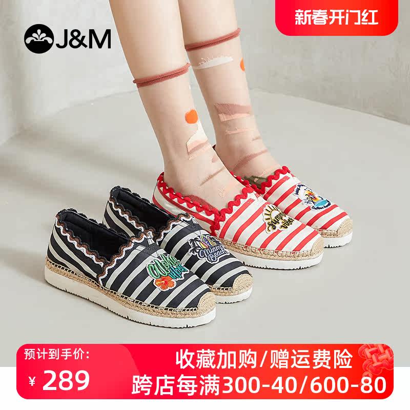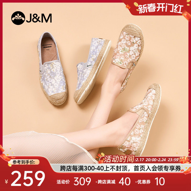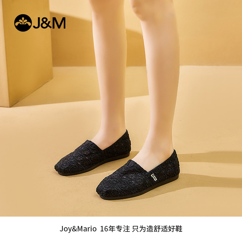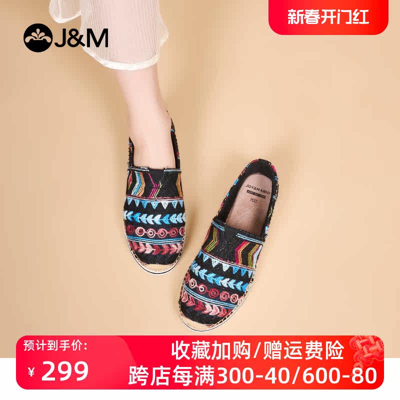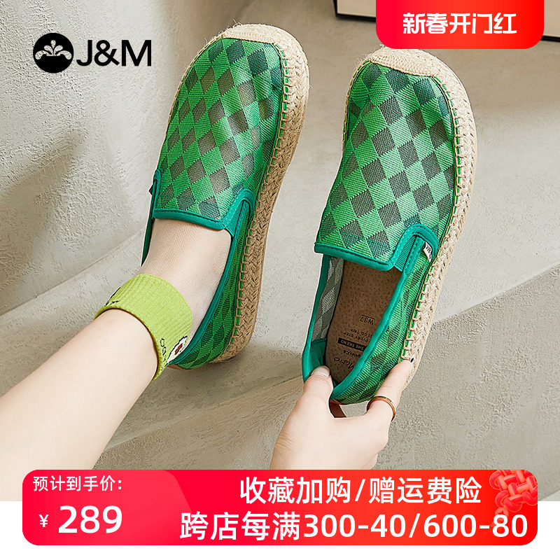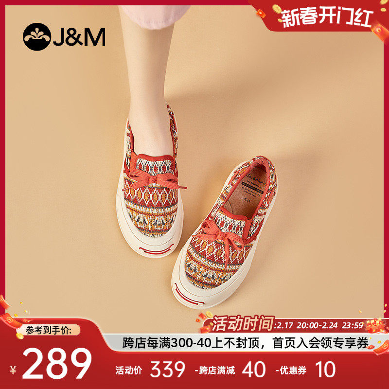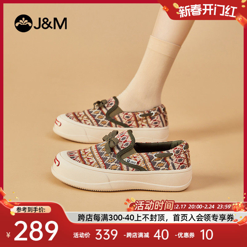 J&M/快乐玛丽女鞋乐福鞋2024春季新款老花开口笑懒人一脚蹬布鞋