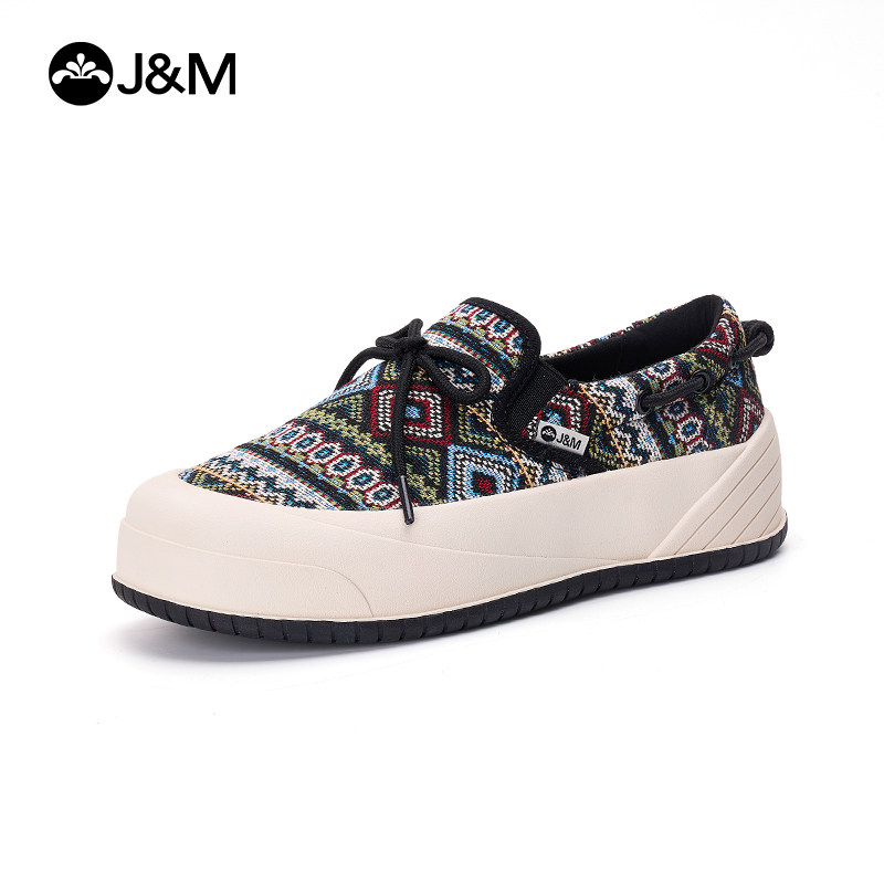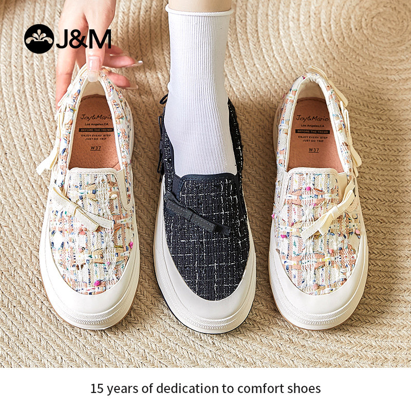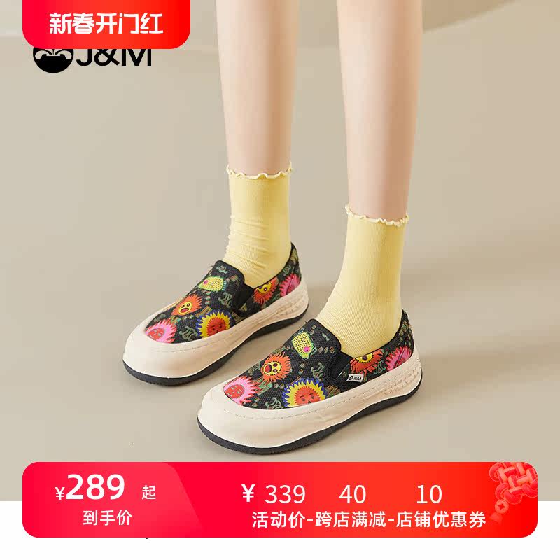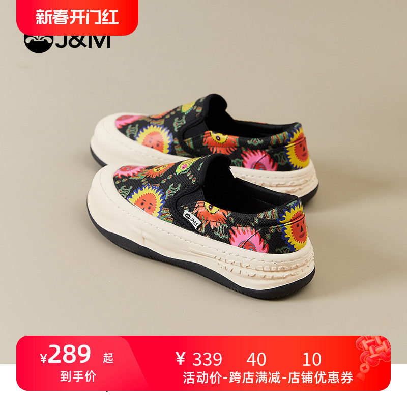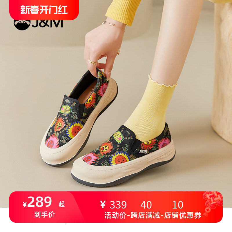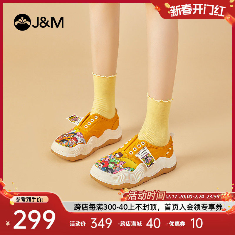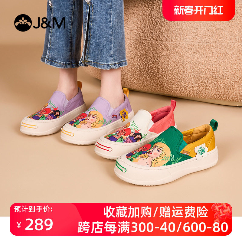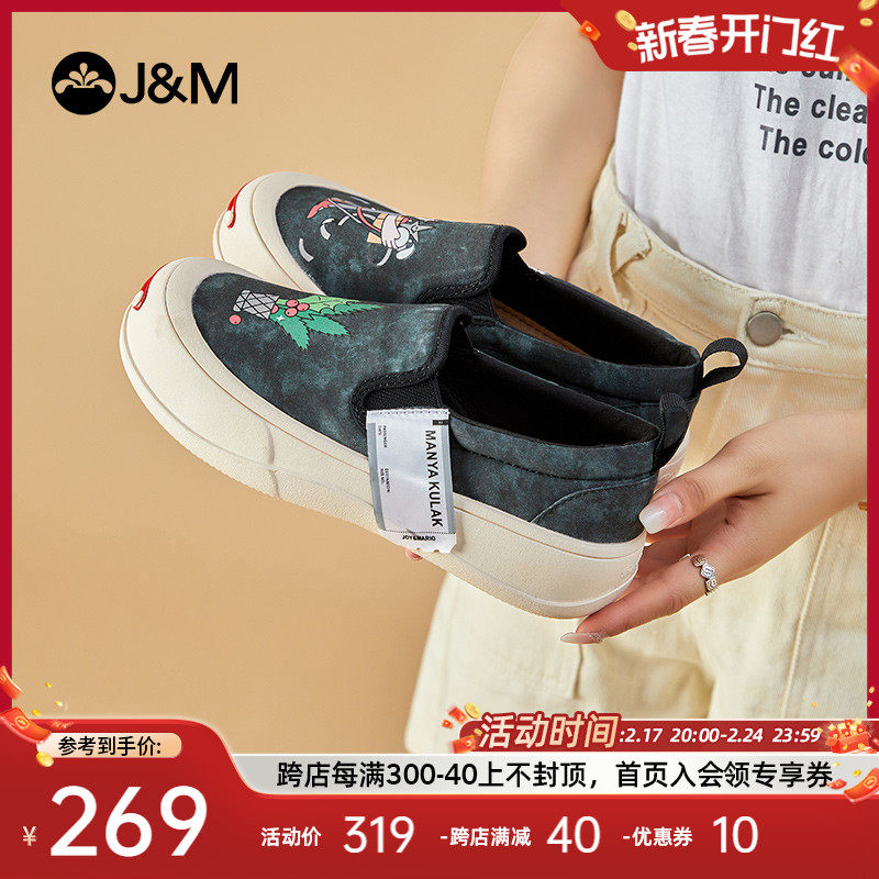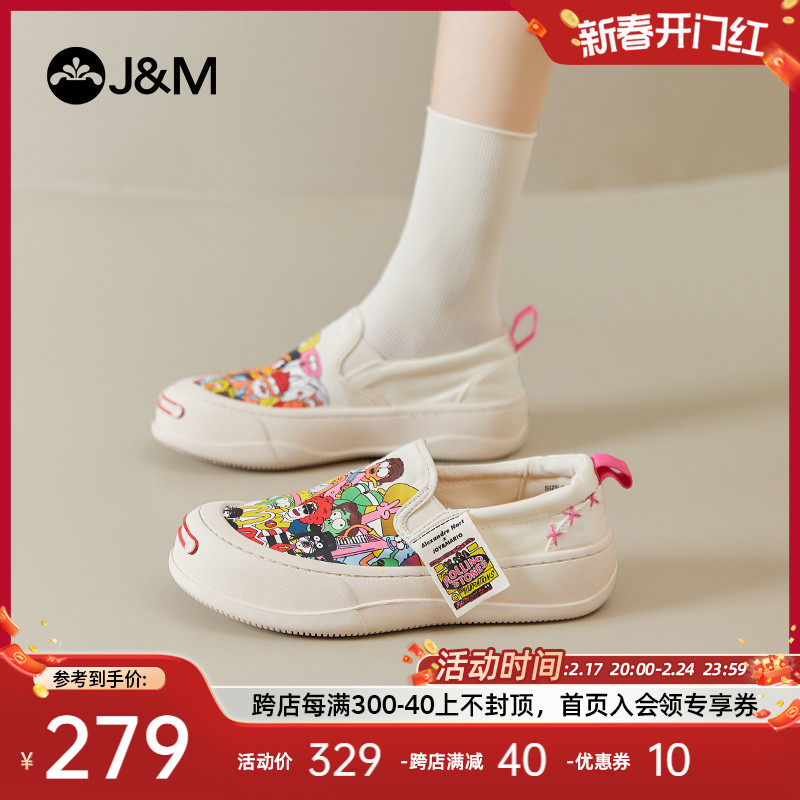 J&M/快乐玛丽女鞋乐福鞋2024春季新款老花开口笑懒人一脚蹬布鞋