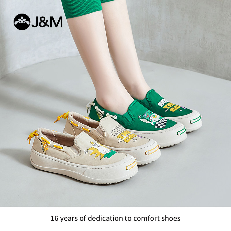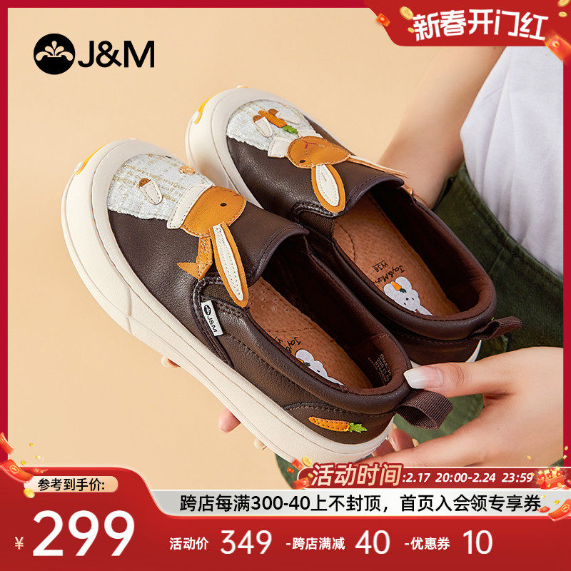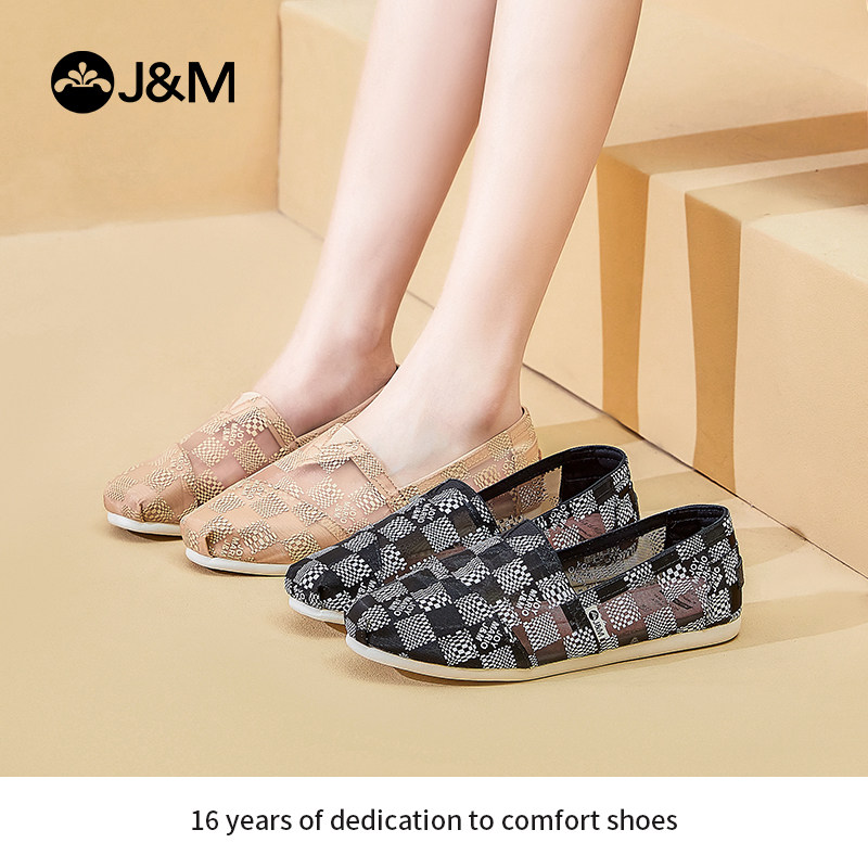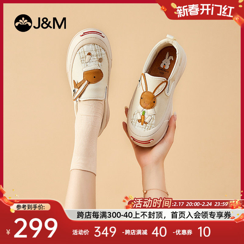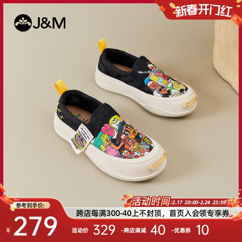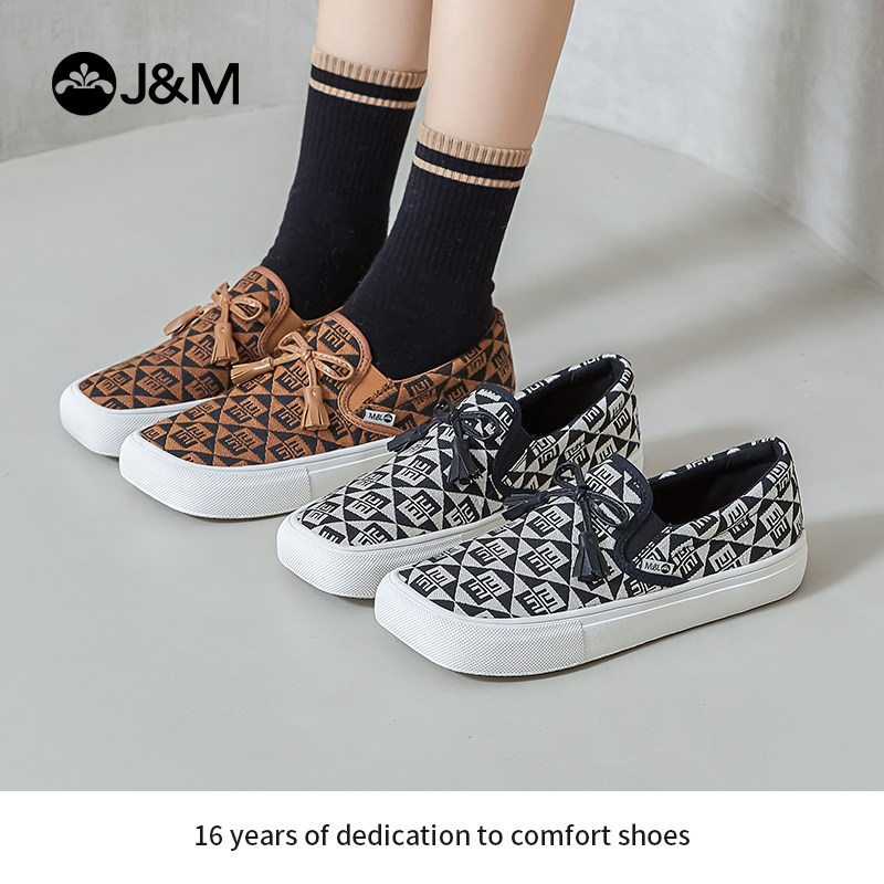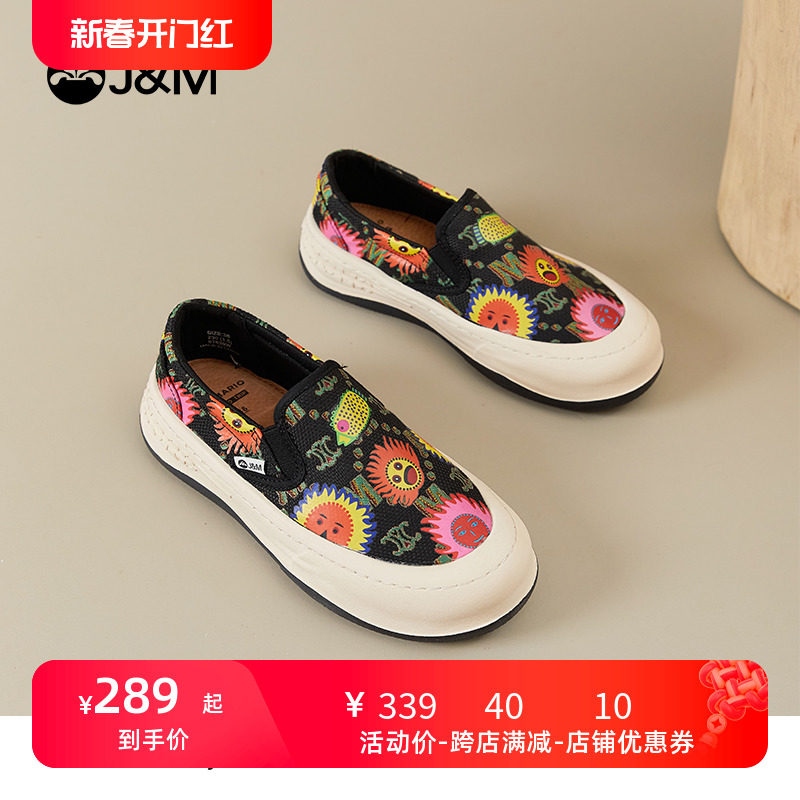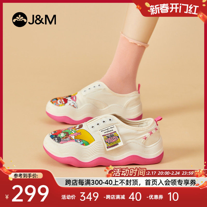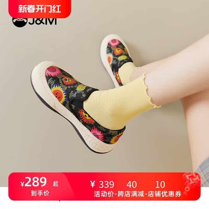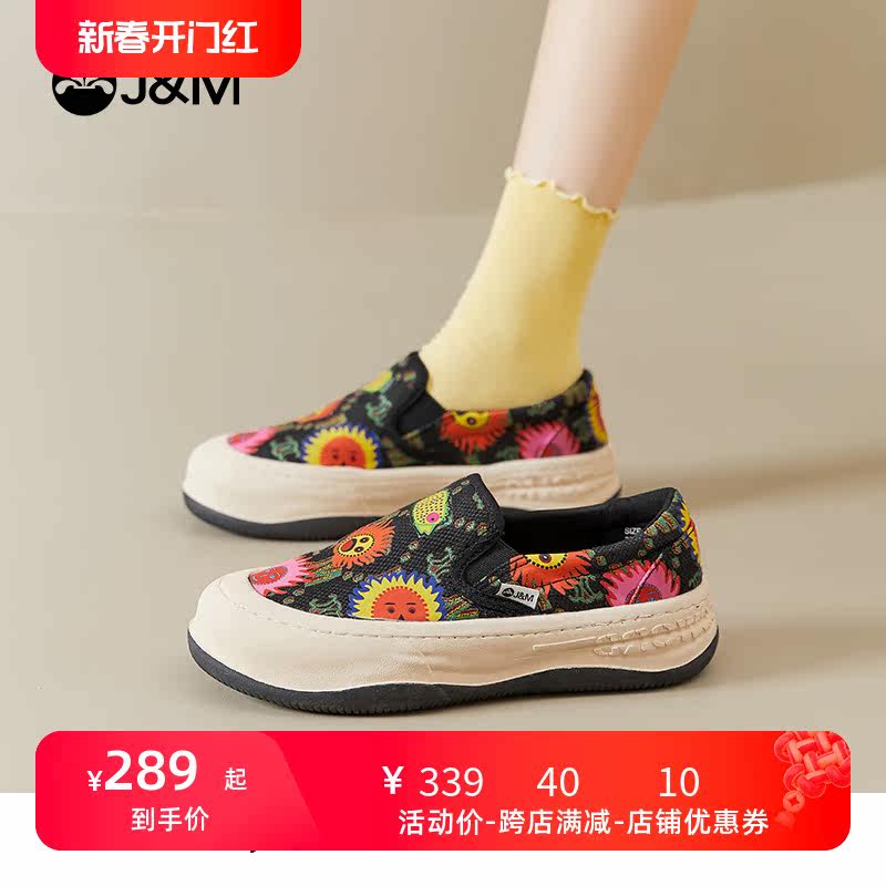 J&M/快乐玛丽女鞋乐福鞋2024春季新款老花开口笑懒人一脚蹬布鞋