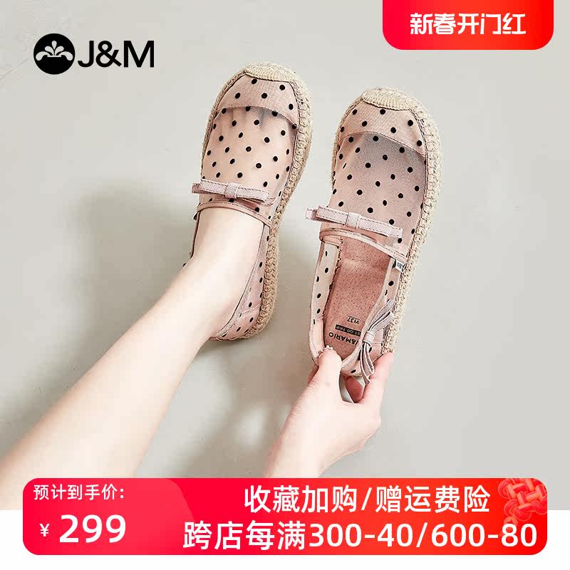 jm快乐玛丽女鞋蕾丝镂空亚麻底凉鞋女蝴蝶结平底休闲鞋布鞋01805W
