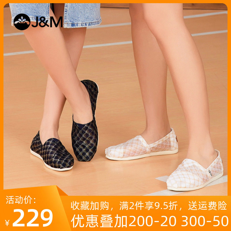 jm快乐玛丽2023新款布鞋女平底低帮镂空帆布鞋女懒人一脚蹬休闲鞋
