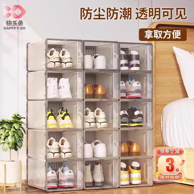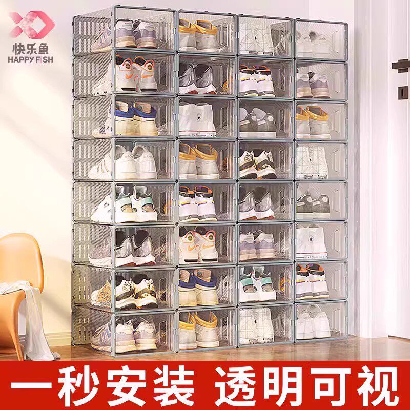 快乐鱼鞋子收纳盒透明鞋盒折叠存放鞋柜塑料鞋架抽屉式省空间神器