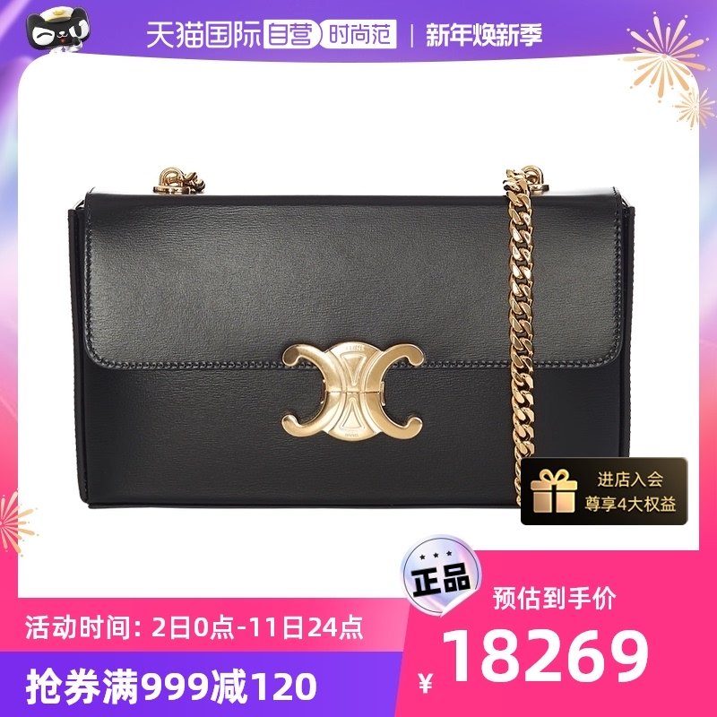 【自营】CELINE思琳凯旋门系列黑色女包光面小牛皮金扣翻盖链条包