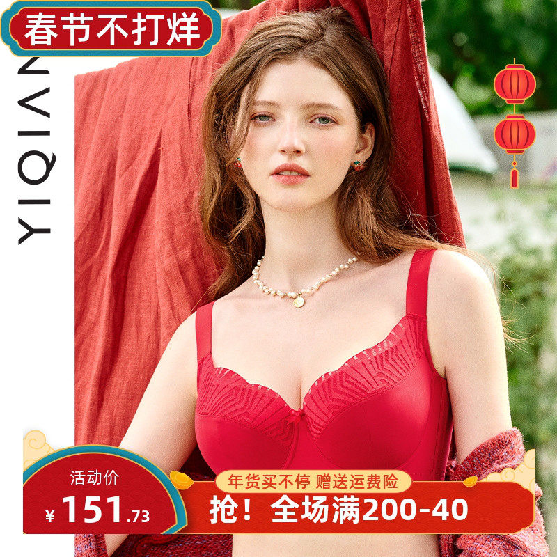 怡倩红色上托聚拢内衣女大胸显小胸罩结婚新娘本命年大码超薄文胸