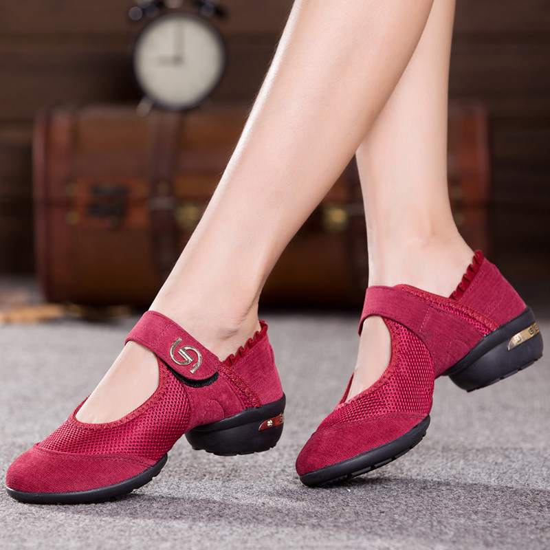 舞蹈鞋女中老年夏季透气中跟广场舞鞋红色软底网面爵士新款妈妈鞋