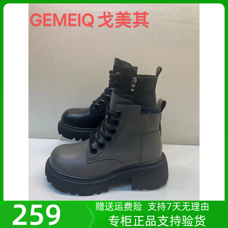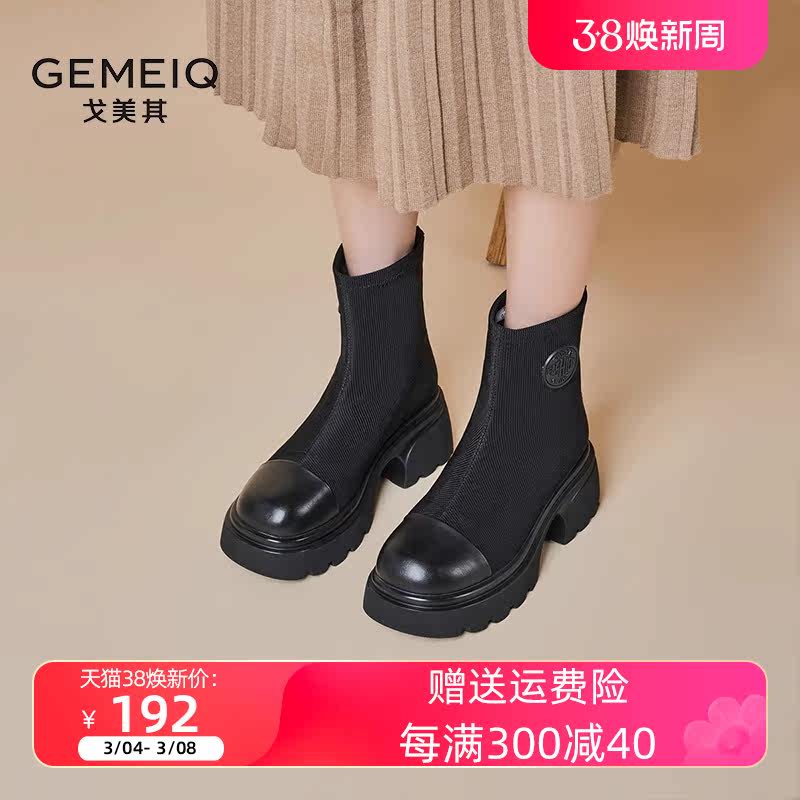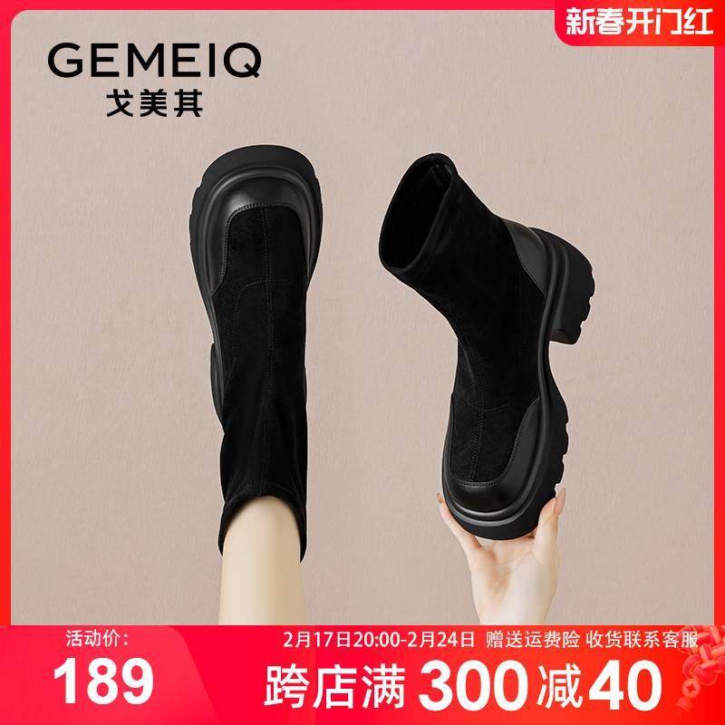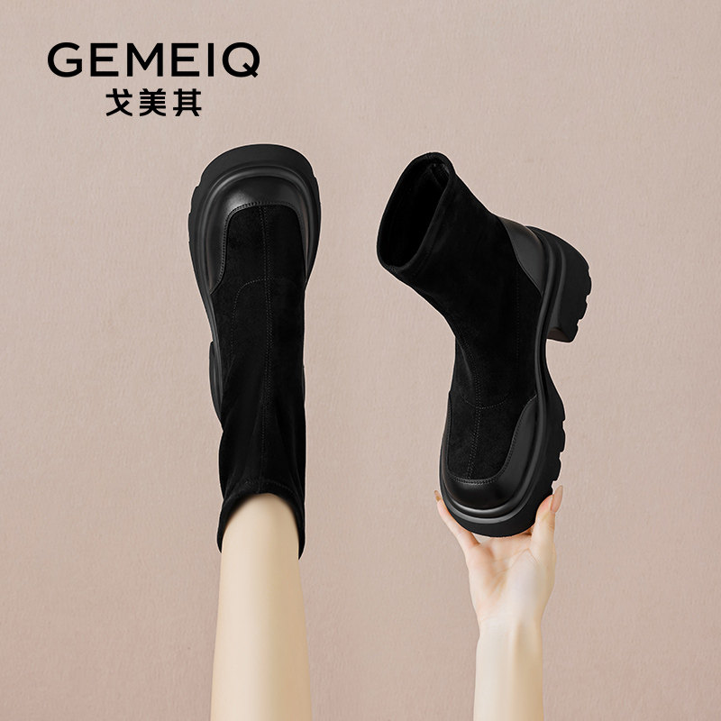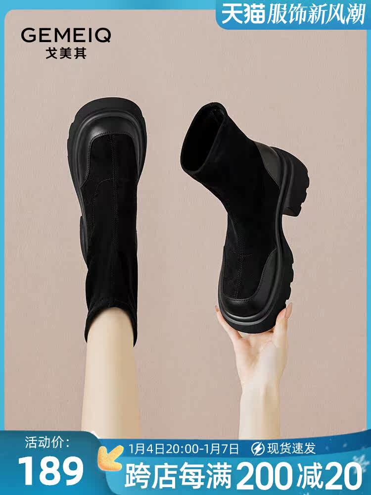 戈美其2023秋冬女鞋厚底靴后拉链单靴弹力短靴小个子增高马丁靴