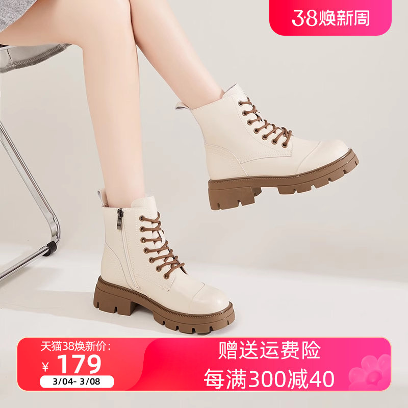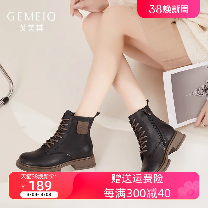 戈美其女鞋2023秋冬新款厚底真皮7孔马丁靴英伦风短靴系带单靴