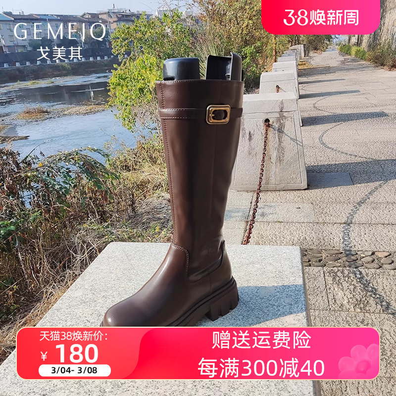 戈美其2023冬新款女鞋厚底不过膝高筒靴时尚显脚小棕色皮带扣长靴