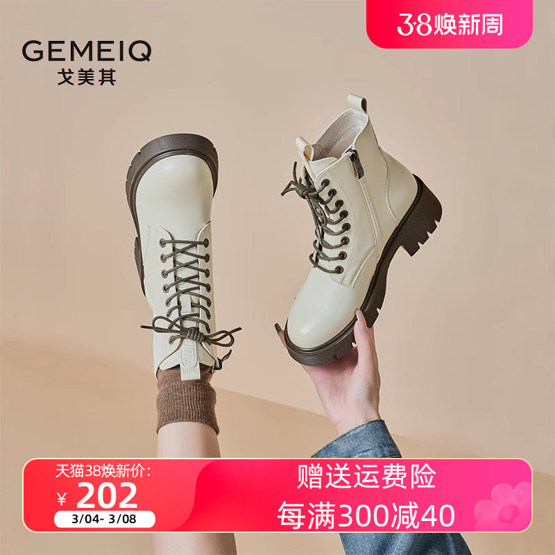 戈美其2023秋冬新款女鞋松糕厚底单靴真皮短靴女系带侧拉链马丁靴