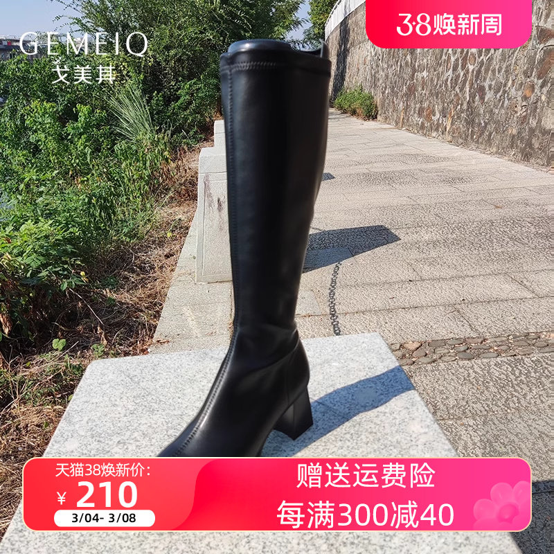 戈美其2023冬新款女鞋粗跟高跟长靴女侧拉链显脚小不过膝高筒靴