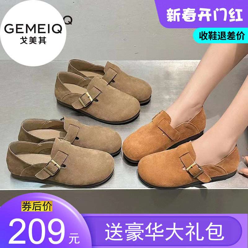 戈美其春冬女鞋复古勃肯鞋懒人鞋外穿皮带扣真皮加绒包头半拖鞋