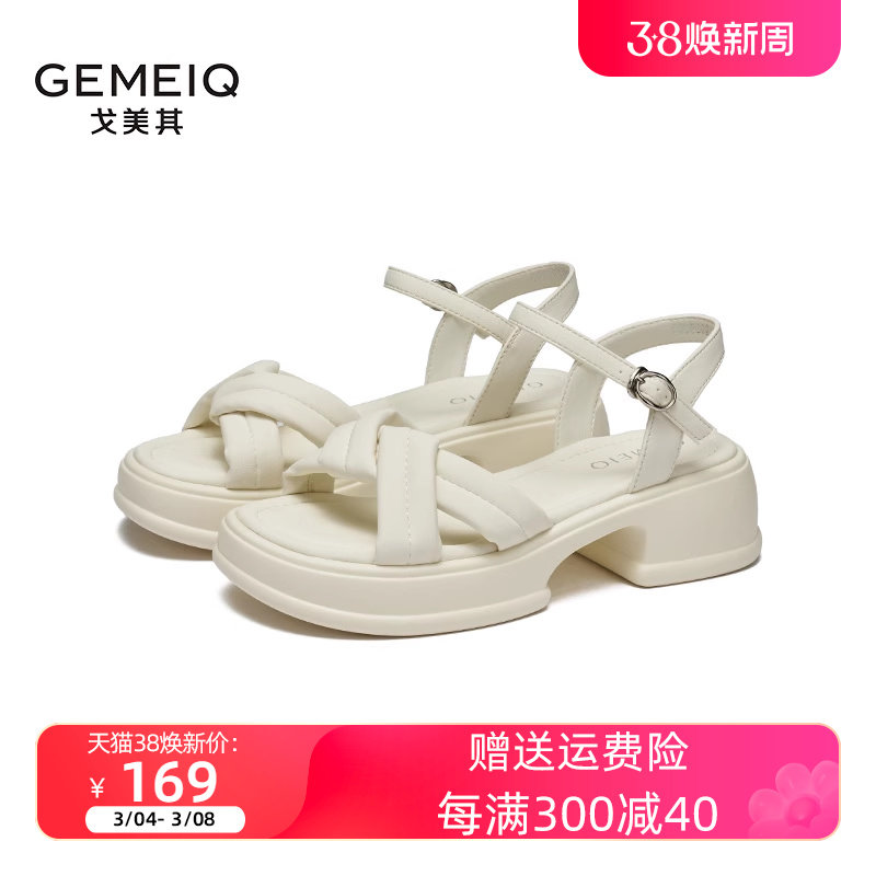 戈美其一字带露趾凉鞋女夏季新款沙滩鞋搭扣米色坡跟厚底凉鞋