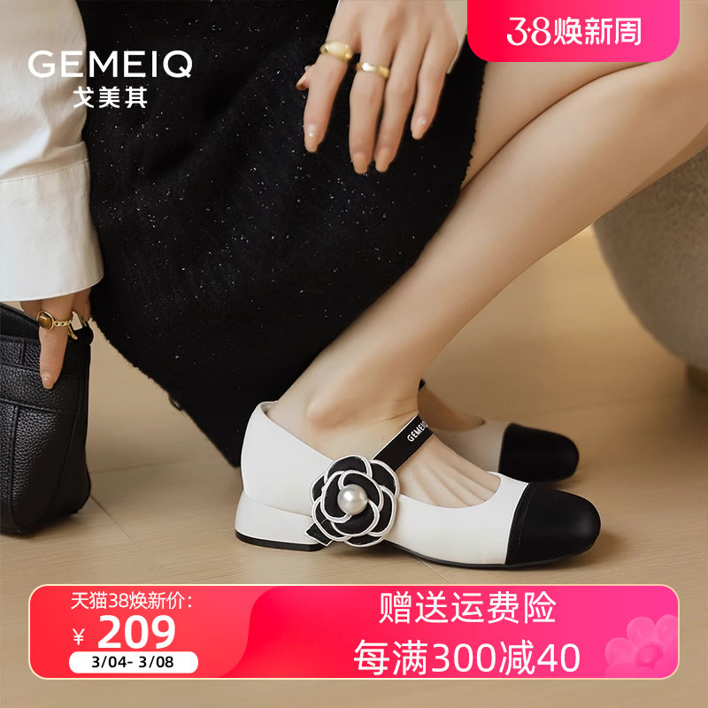戈美其2024春女鞋小香风低跟单鞋女魔术贴撞色珍珠山茶花玛丽珍鞋
