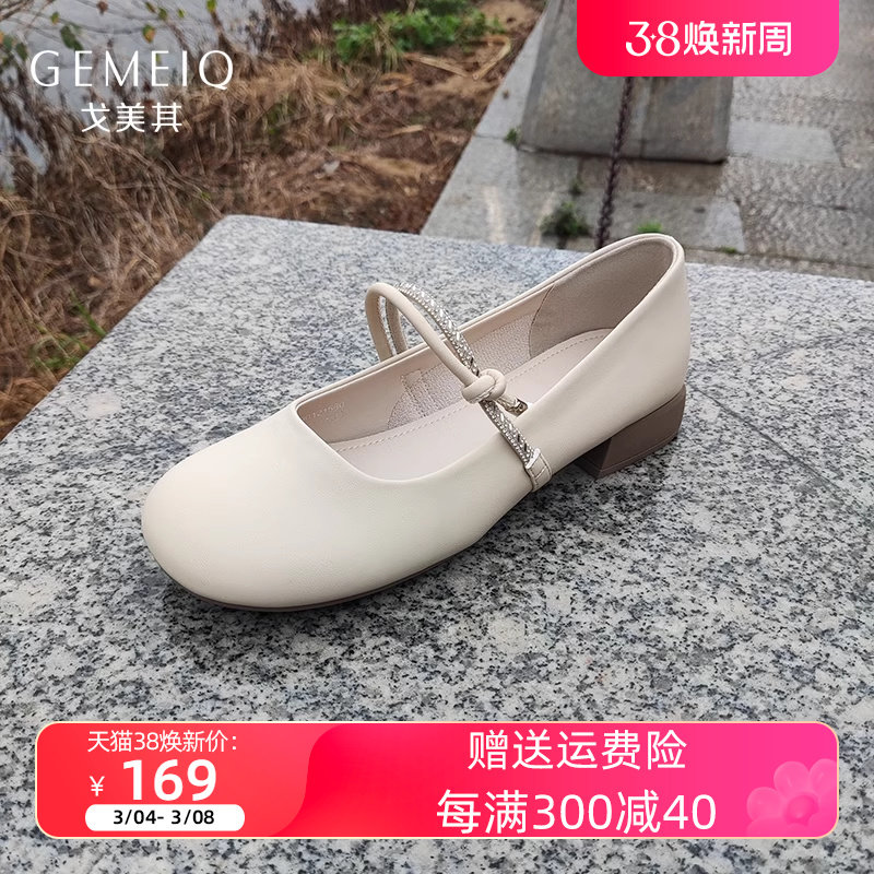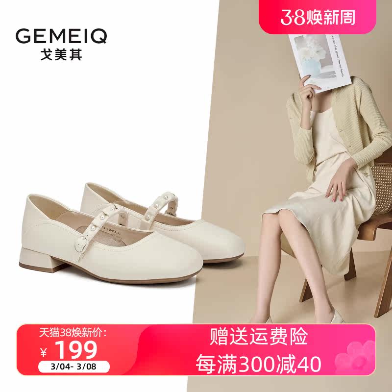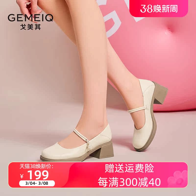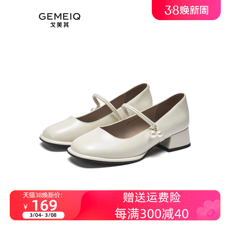 戈美其2024春新款复古一鞋两穿带珍珠中跟单鞋女米色粗跟玛丽珍鞋