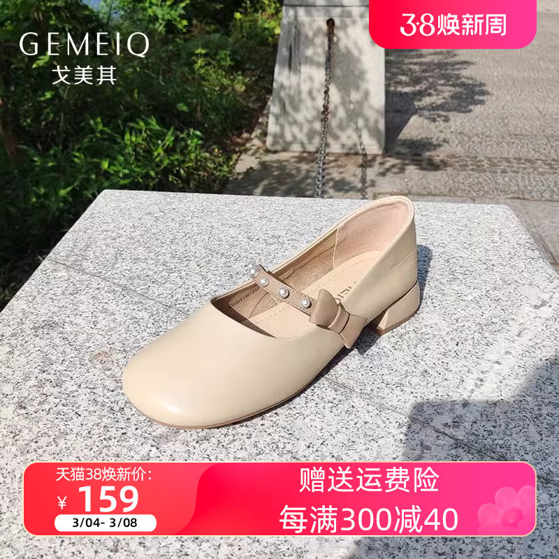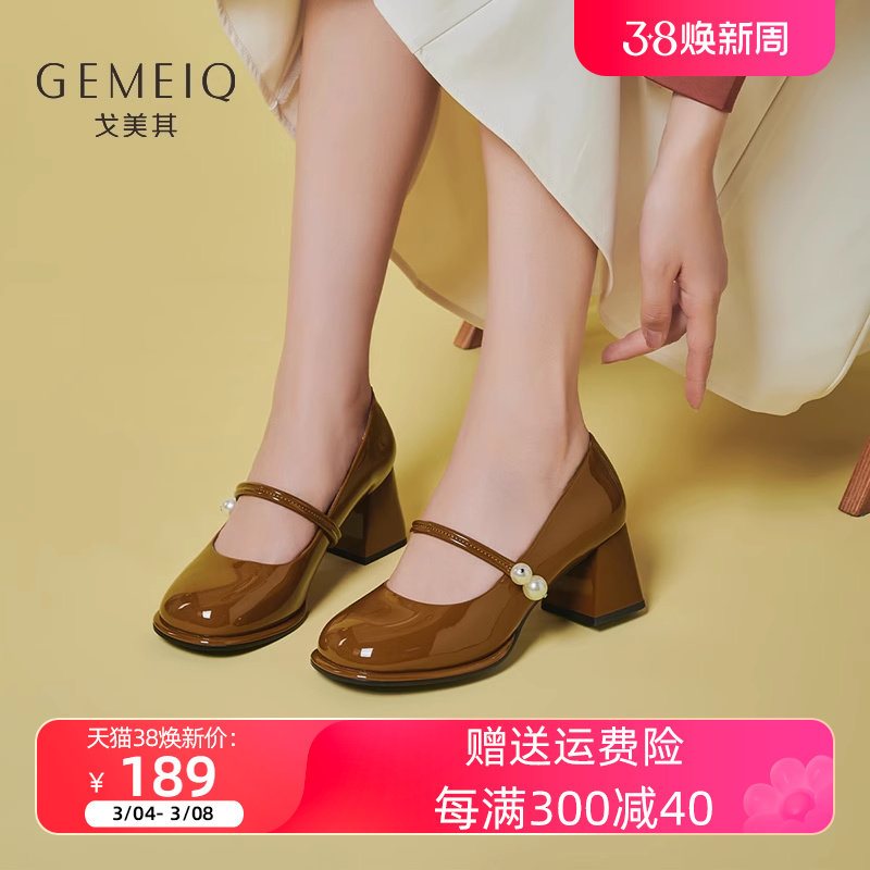 戈美其2023浅口时尚休闲单鞋女珍珠棕色中跟玛丽珍鞋商场同款女鞋