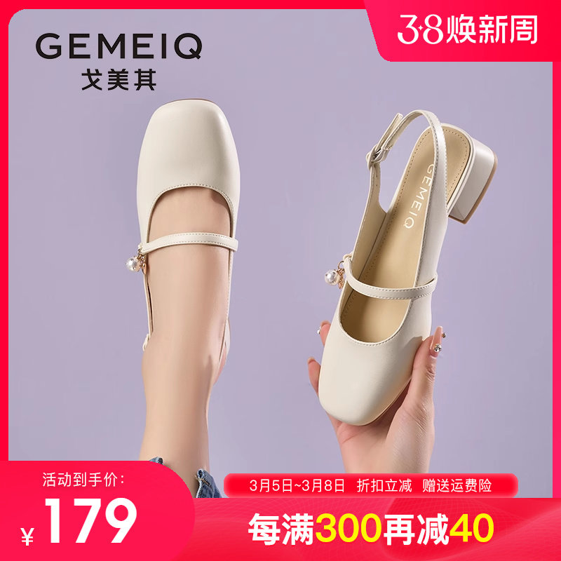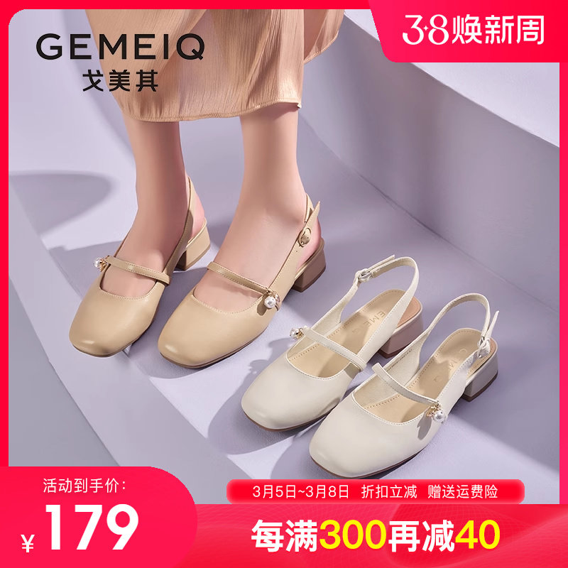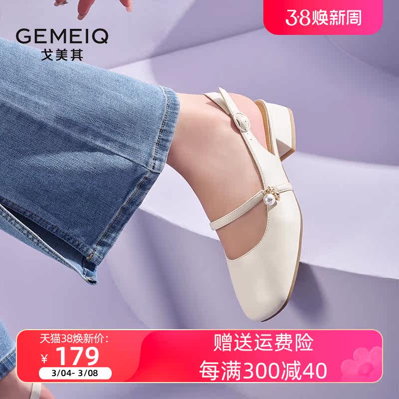 戈美其 包头凉鞋2024夏女鞋珍珠一字带玛丽珍鞋粗跟方跟后空单鞋