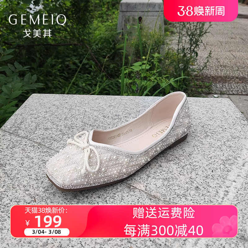 戈美其春方头软底平底单鞋女蝴蝶结水钻珍珠女鞋商场同款船鞋