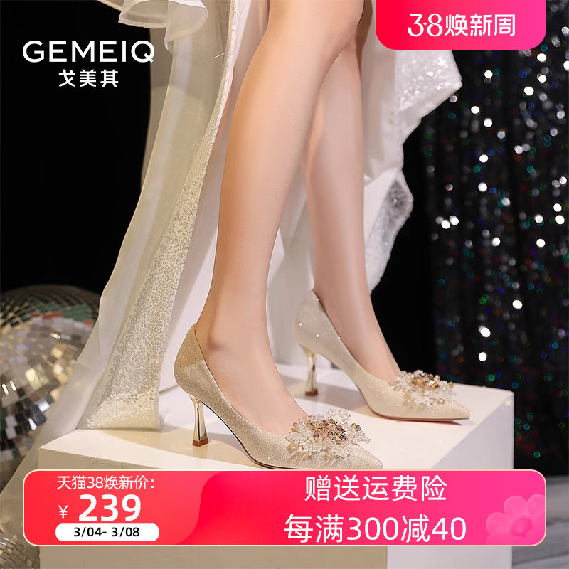 戈美其2024年春季新款香槟色婚鞋女高跟单鞋细跟不累脚珍珠新娘鞋