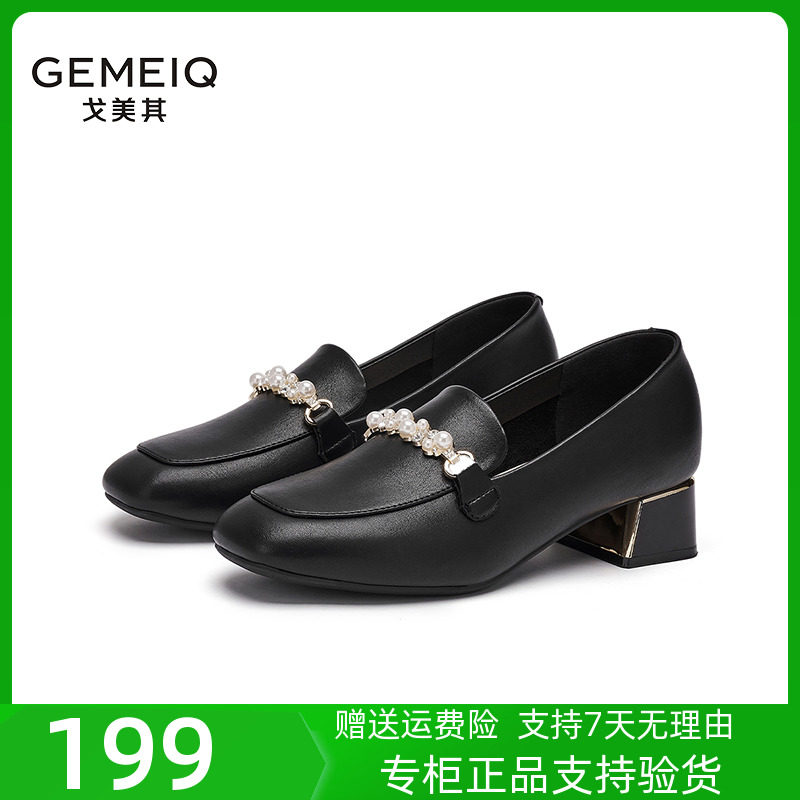 戈美其粗跟乐福鞋女春季单鞋2024新款珍珠一脚蹬百搭英伦风小皮鞋