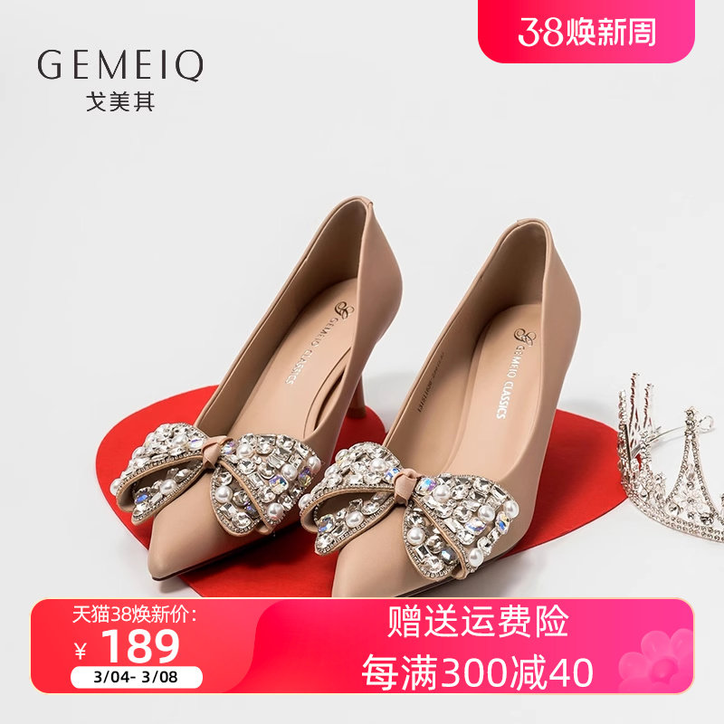 戈美其秋新款女鞋商场同款水钻蝴蝶结高跟鞋细跟单鞋女珍珠伴娘鞋