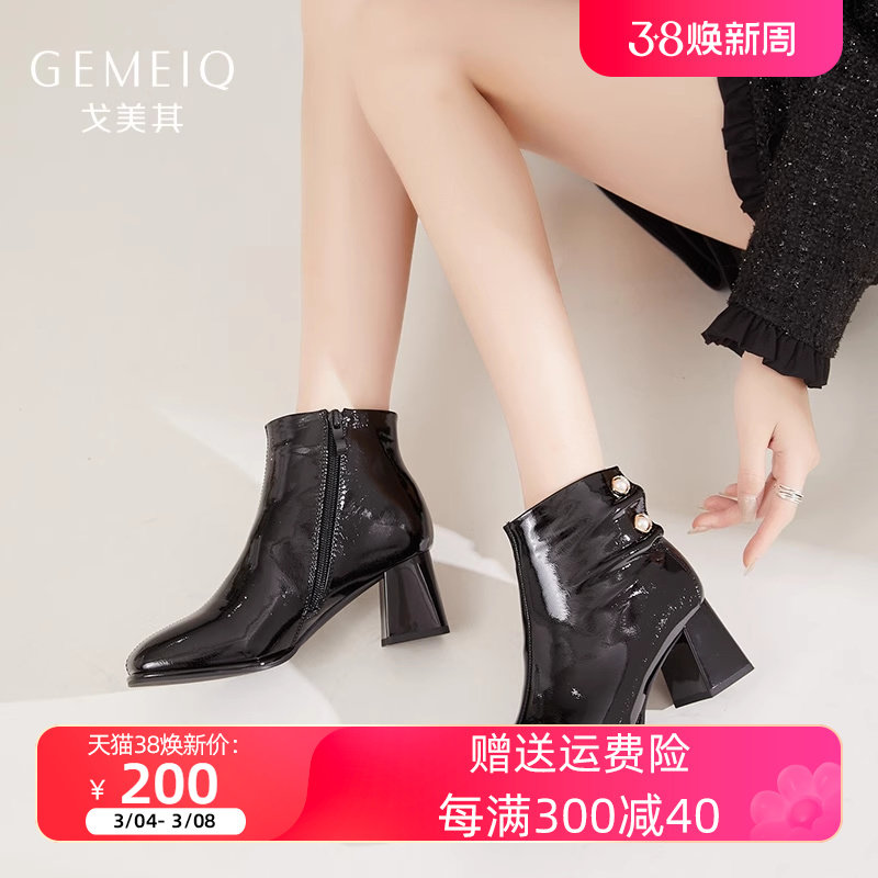 戈美其2023秋新款漆皮中跟女短靴珍珠饰扣侧拉链优雅女粗跟时装靴