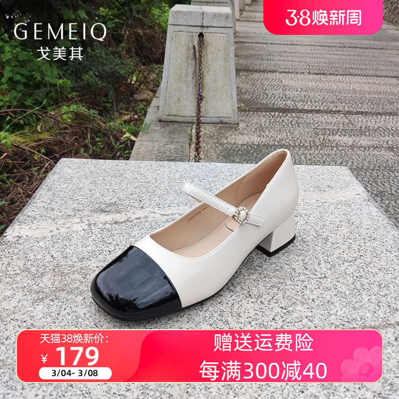 戈美其春秋新款方头粗跟玛丽珍鞋女拼接小香风珍珠中跟女单鞋