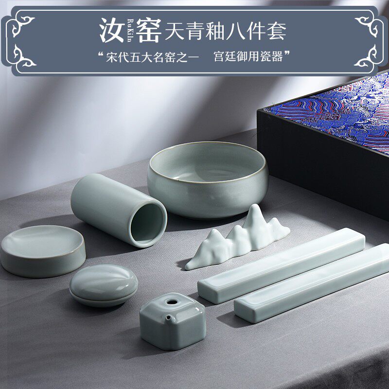 成竹堂文房四宝精品套装高档礼盒品笔墨纸砚汝窑陶瓷笔洗三件套笔