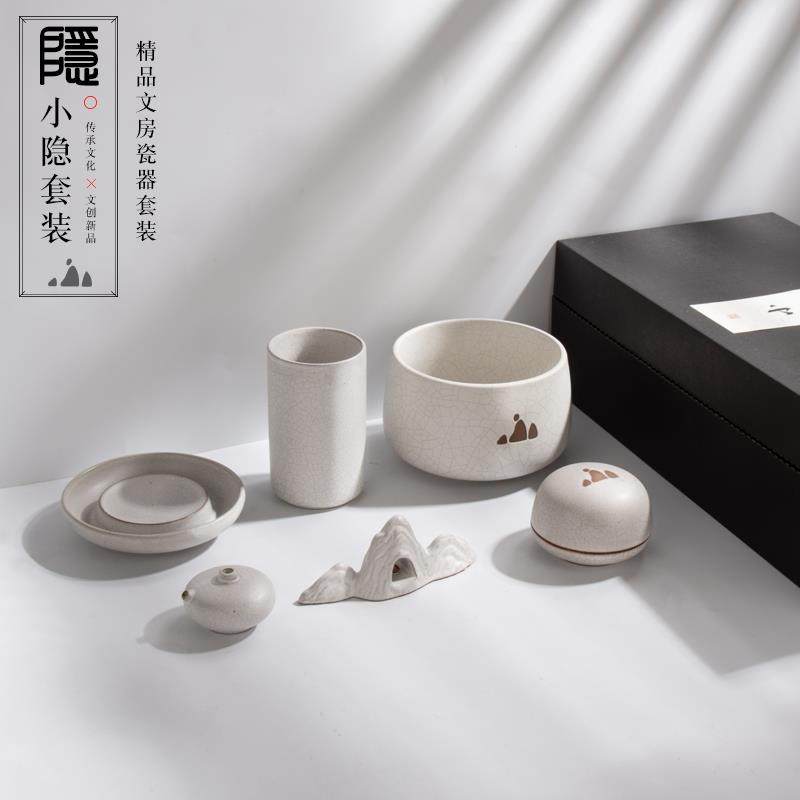 直销成竹堂文房四宝礼盒白瓷套装雪峰江行图送礼陶瓷毛笔笔山笔搁