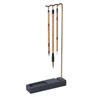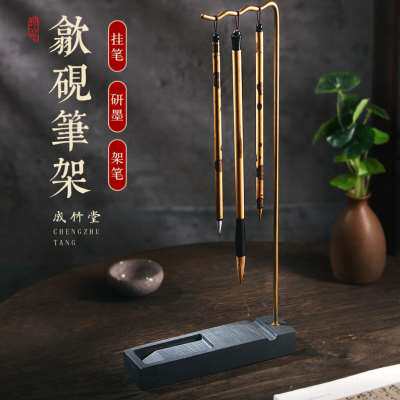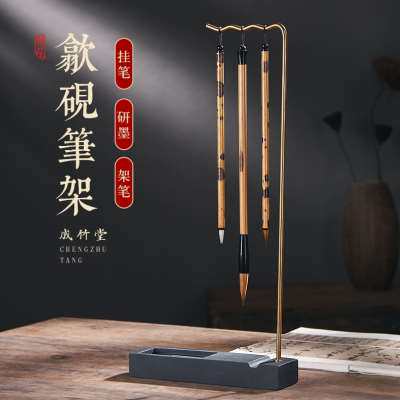 定制成竹堂纯铜架带原石砚台毛笔架笔挂架子放笔架晾毛笔托挂架摆