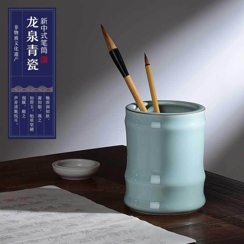 成竹堂陶瓷笔筒笔洗青瓷创意摆件文房四宝书法用品毛笔套装初学练