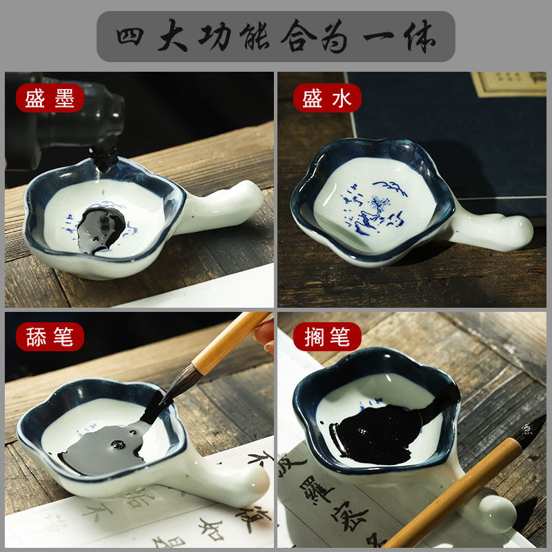 成竹堂墨碟陶瓷多功能水碟小号毛笔架子盛墨装墨笔添笔搁砚台笔洗