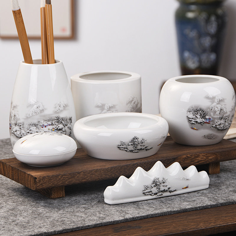 直销成竹堂文房四宝礼盒白瓷套装雪峰江行图送礼陶瓷毛笔笔山笔搁