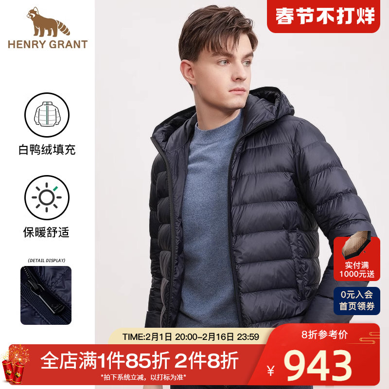亨利格兰报喜鸟男装冬季新品男休闲连帽保暖白鸭绒外套百搭羽绒服