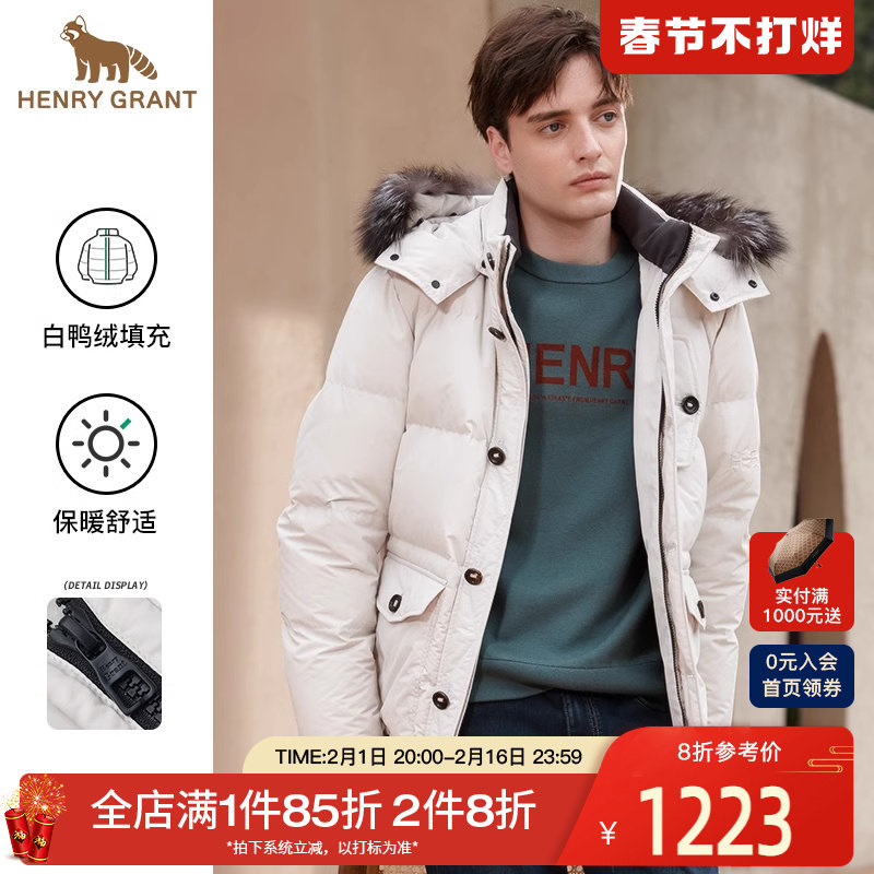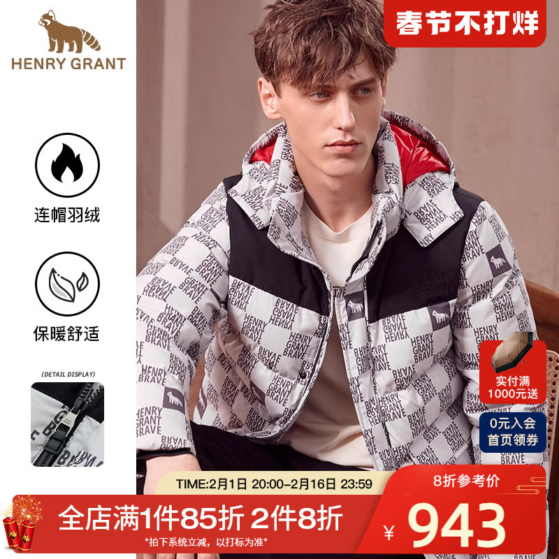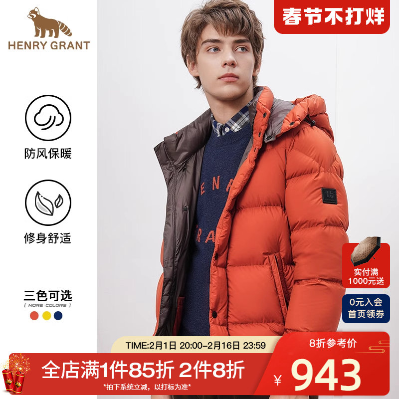 亨利格兰报喜鸟英伦男休闲保暖白鸭绒连帽羽绒服 春节拜年喜庆红