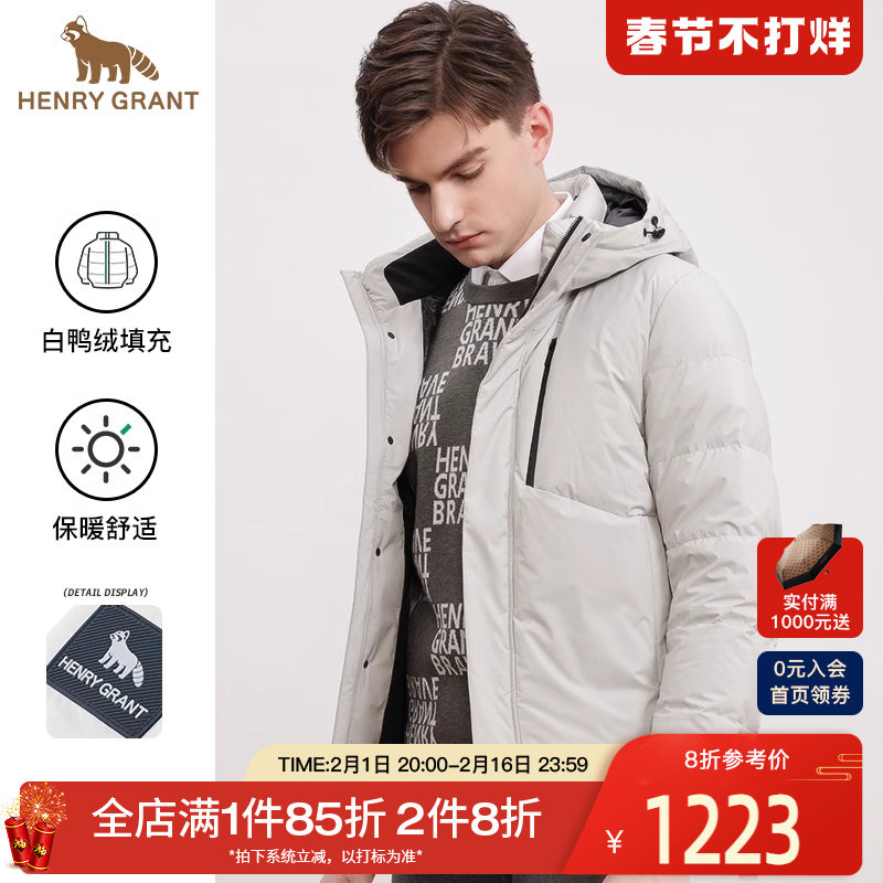 亨利格兰报喜鸟男装冬季新品商务休闲连帽中长款羽绒服白鸭绒外套