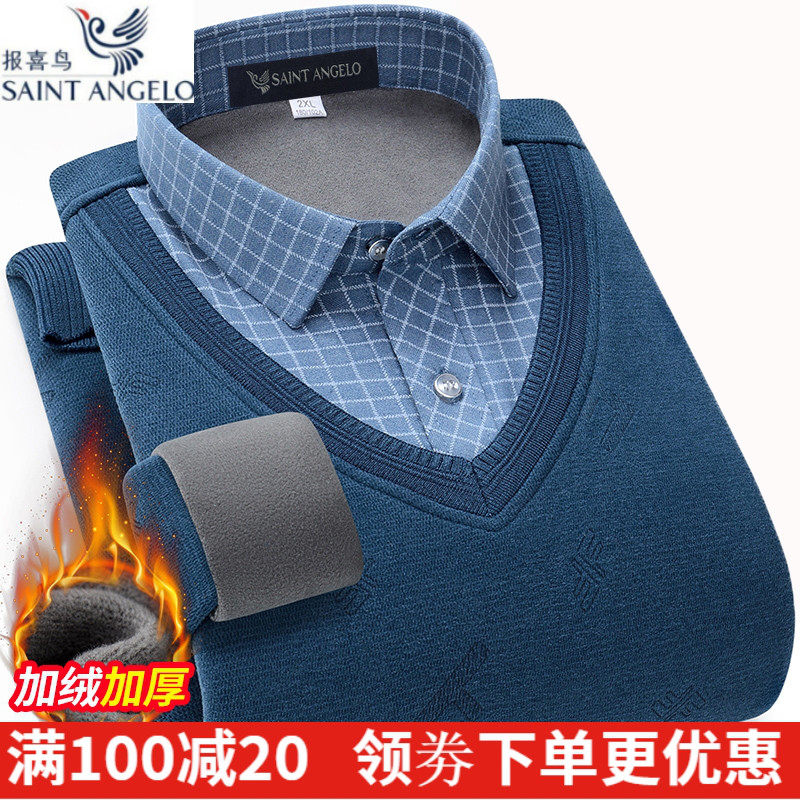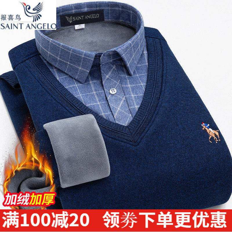 报喜鸟假两件保暖衬衫男加绒中老年套头针织羊绒免烫衬衣加厚毛衣